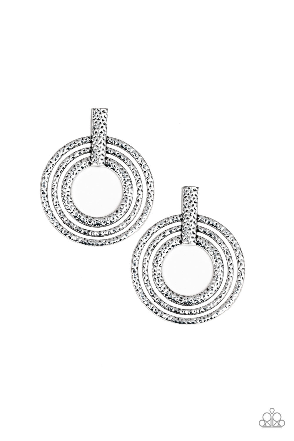 Delicately hammered in antiqued shimmer, glistening silver circles attach to a rectangular silver fitting, spiraling into an dizzying frame. Features a standard post fitting.