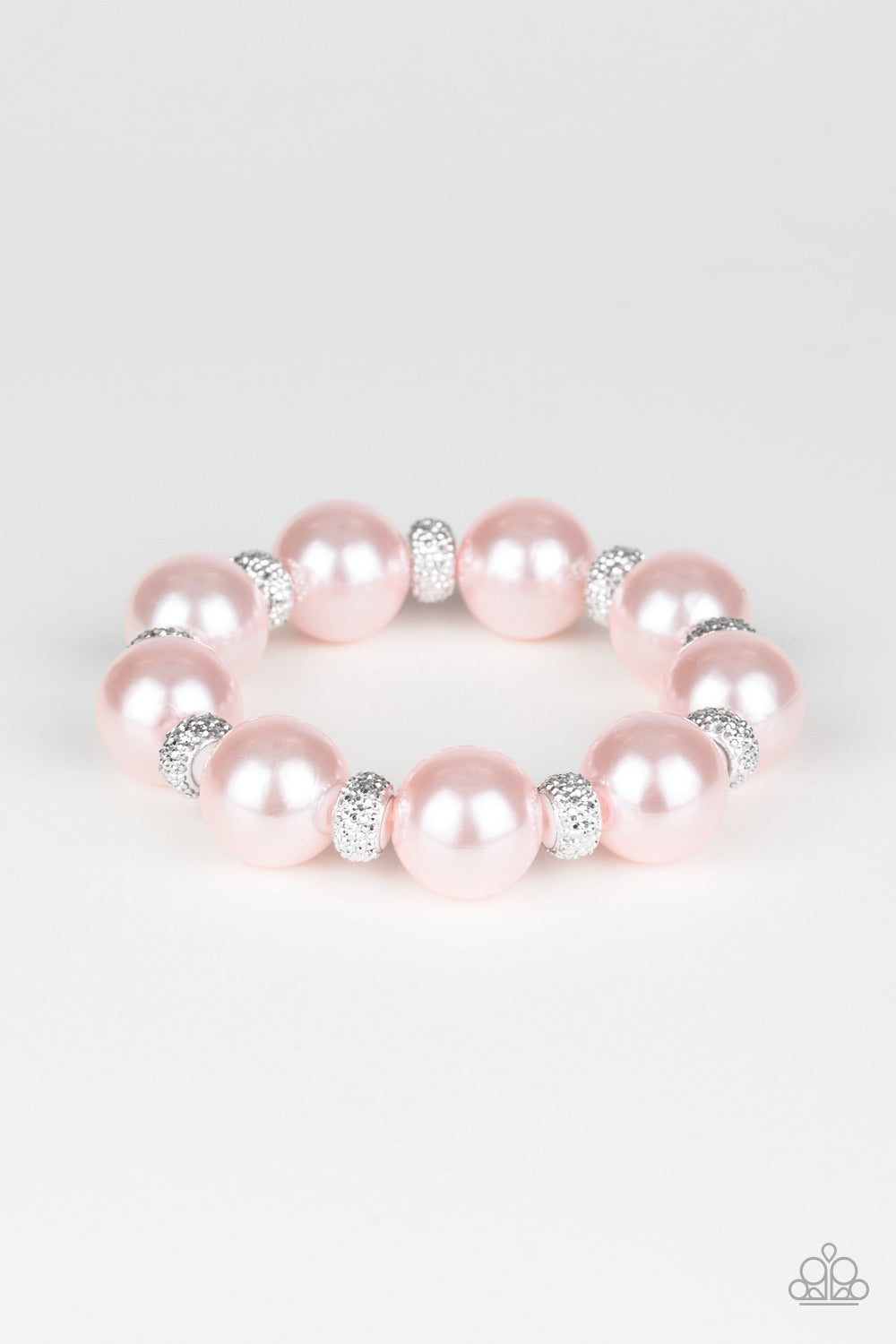 A refined collection of oversized pink pearls and glittery metallic encrusted silver beads are threaded along a stretchy band around the wrist for a glamorous touch.