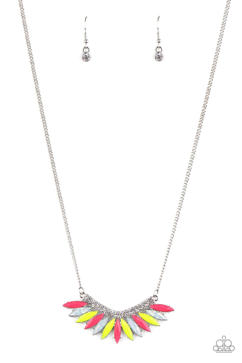 Faceted neon yellow, opalescent crystal-like, and neon pink beads fan out from the bottom of a bowing silver frame encrusted in two rows of glassy white rhinestones. The flamboyant frame swings from the bottom of a dainty silver chain, adding a vivacious splash of color to any outfit. Features an adjustable clasp closure.