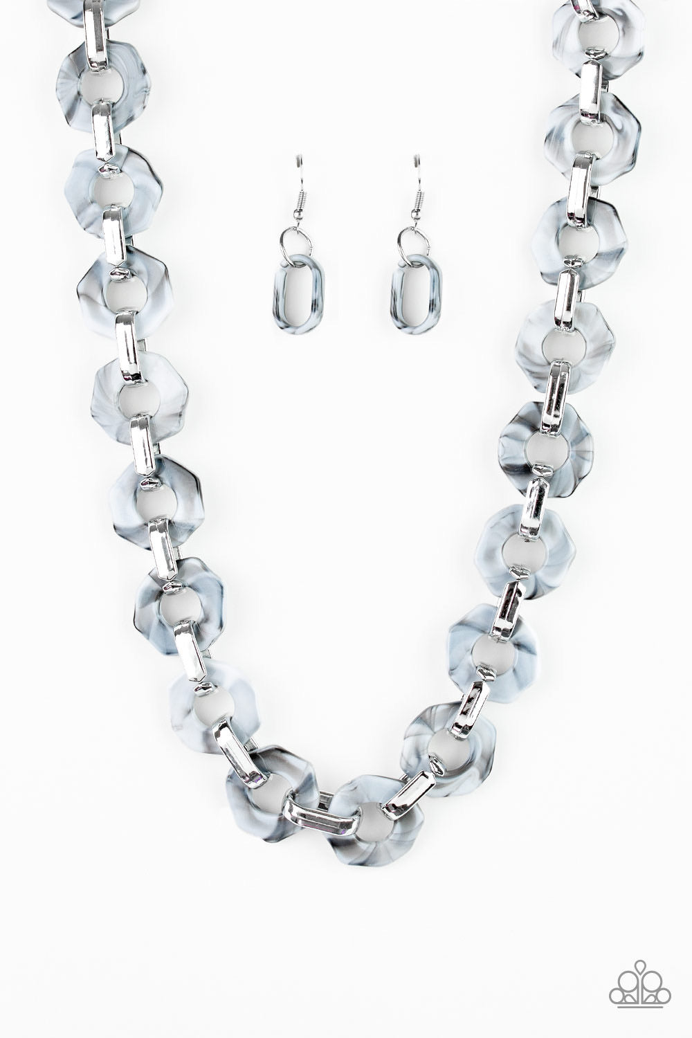 Glistening silver fittings link with smoky hexagon-like acrylic frames below the collar for a seasonal flair. Features an adjustable clasp closure.