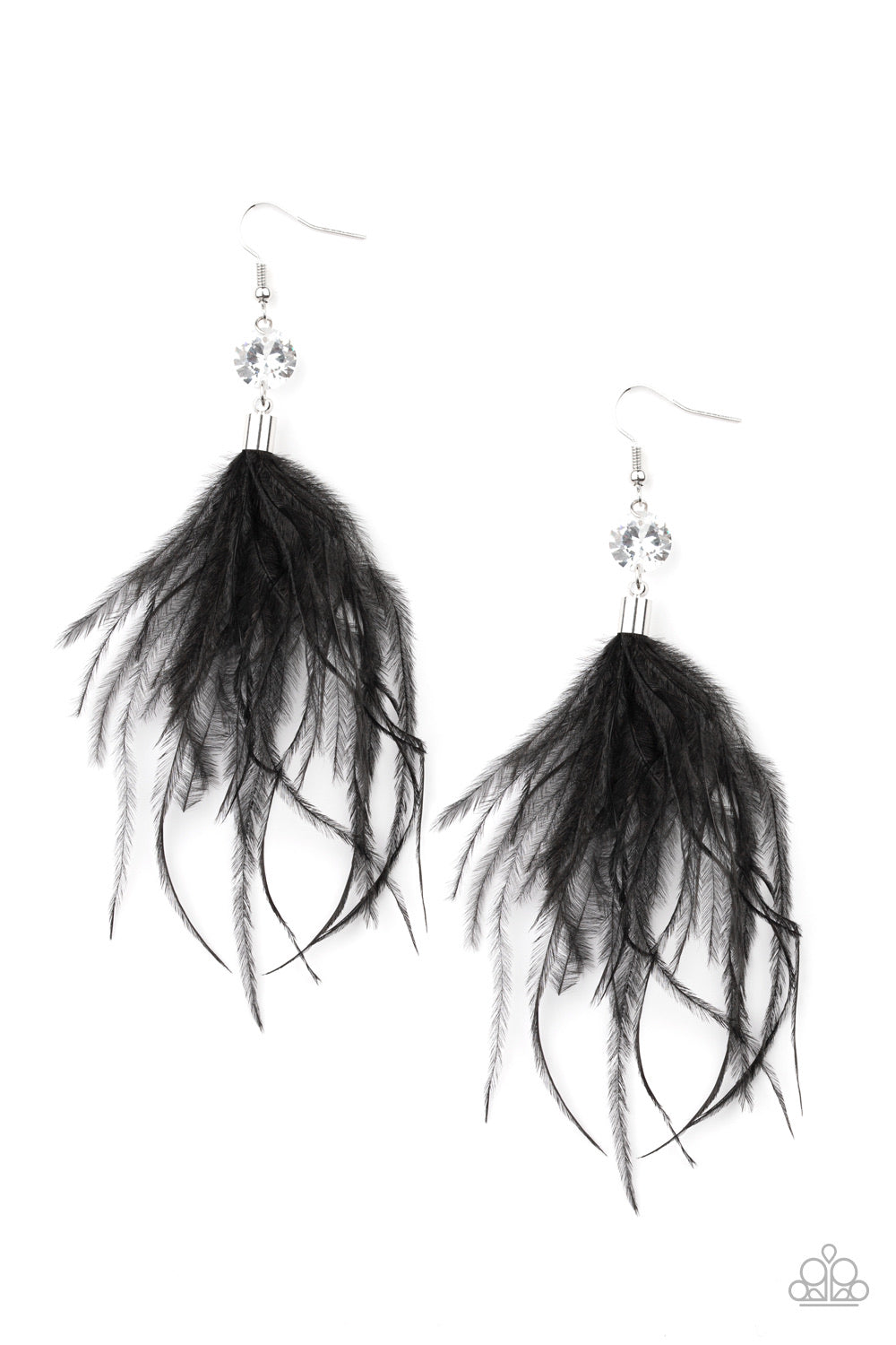 Fuzzy black feathers swing from the bottom of an oversized white rhinestone, creating a refined lure. Earring attaches to a standard fishhook fitting.