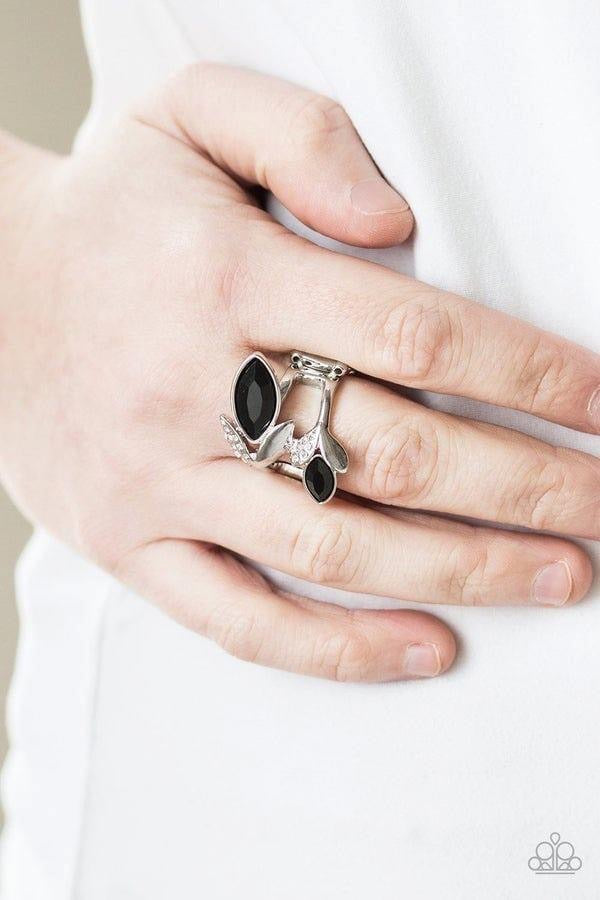 White rhinestone encrusted frames, leafy silver frames, and glittery marquise style rhinestones bloom across the finger for a refined look. Features a stretchy band for a flexible fit.
