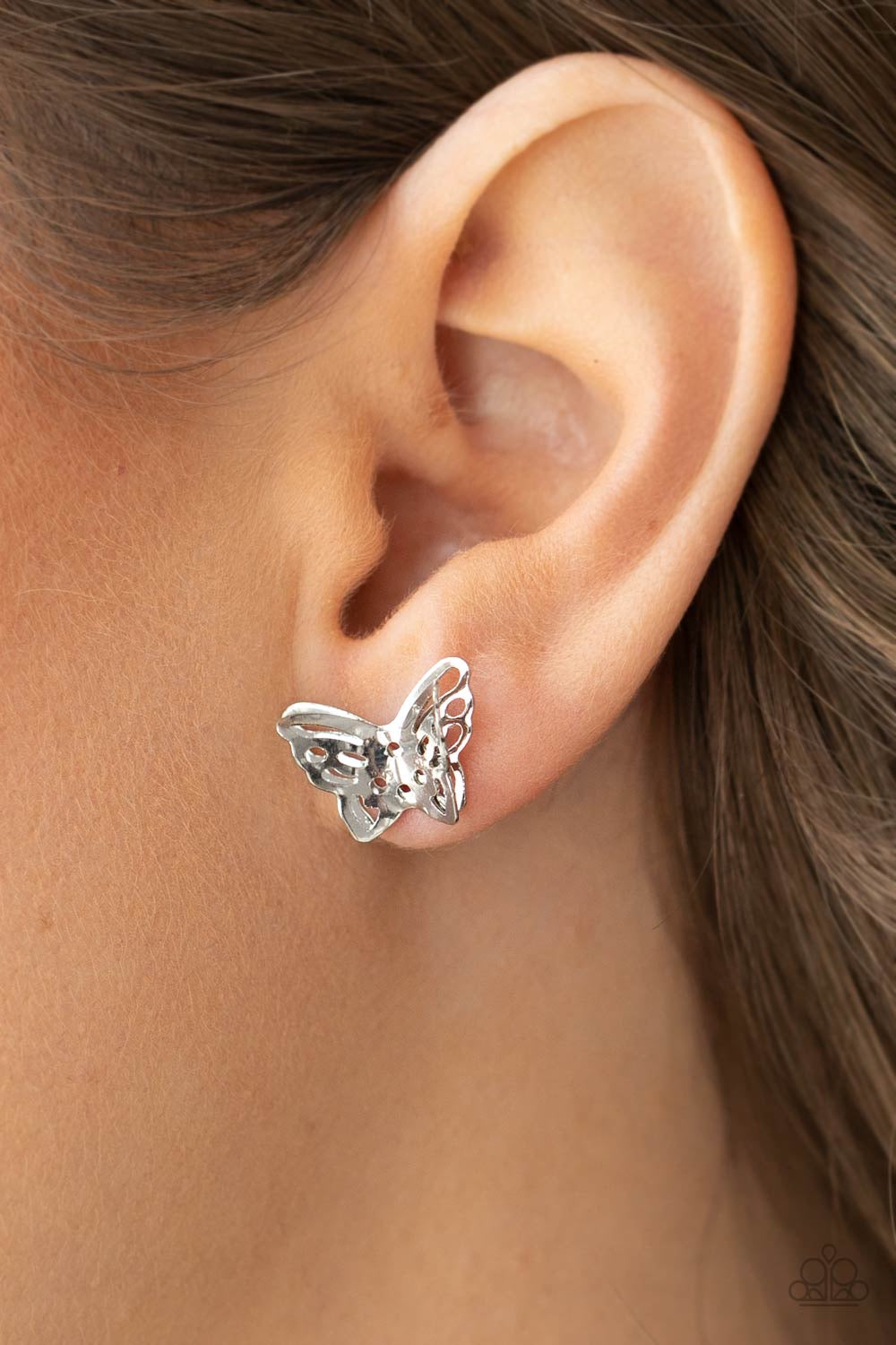 Delicately stenciled in airy cutouts, two layers of silver wings delicately overlap into a fluttery butterfly for a whimsical fashion. Earring attaches to a standard post fitting.