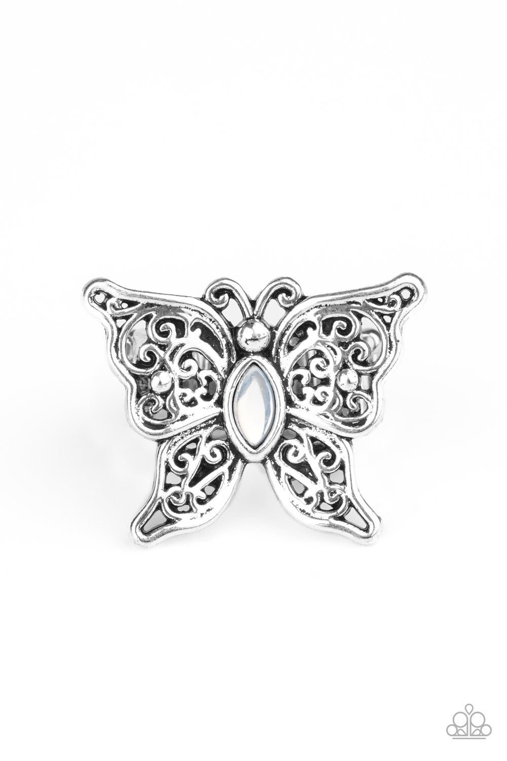 Lacy silver wings bloom from an opalescent white cat's eye center, coalescing into a whimsical butterfly atop the finger. Features a stretchy band for a flexible fit.Lacy silver wings bloom from an opalescent white cat's eye center, coalescing into a whimsical butterfly atop the finger. Features a stretchy band for a flexible fit.