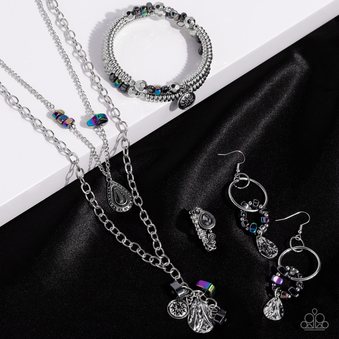 A collection of silver studs, bits of hematite, and oil spill-coated stones create a shimmery hoop that loops through a classic silver hoop above. Adding in texture, a hammered, silver teardrop hangs from the bottom of the interlocking hoops for some eye-catching movement. Earring attaches to a standard fishhook fitting. Due to its prismatic palette, color may vary.