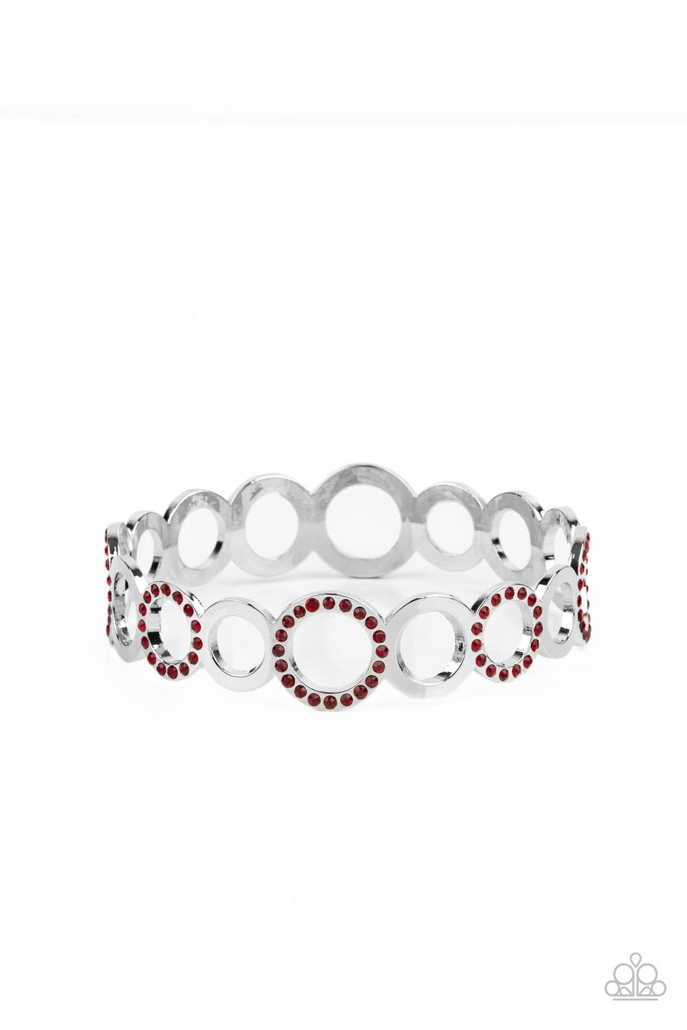 A glittery collection of fiery red rhinestone encrusted rings and shiny silver hoops coalesce into an airy bangle around the wrist.