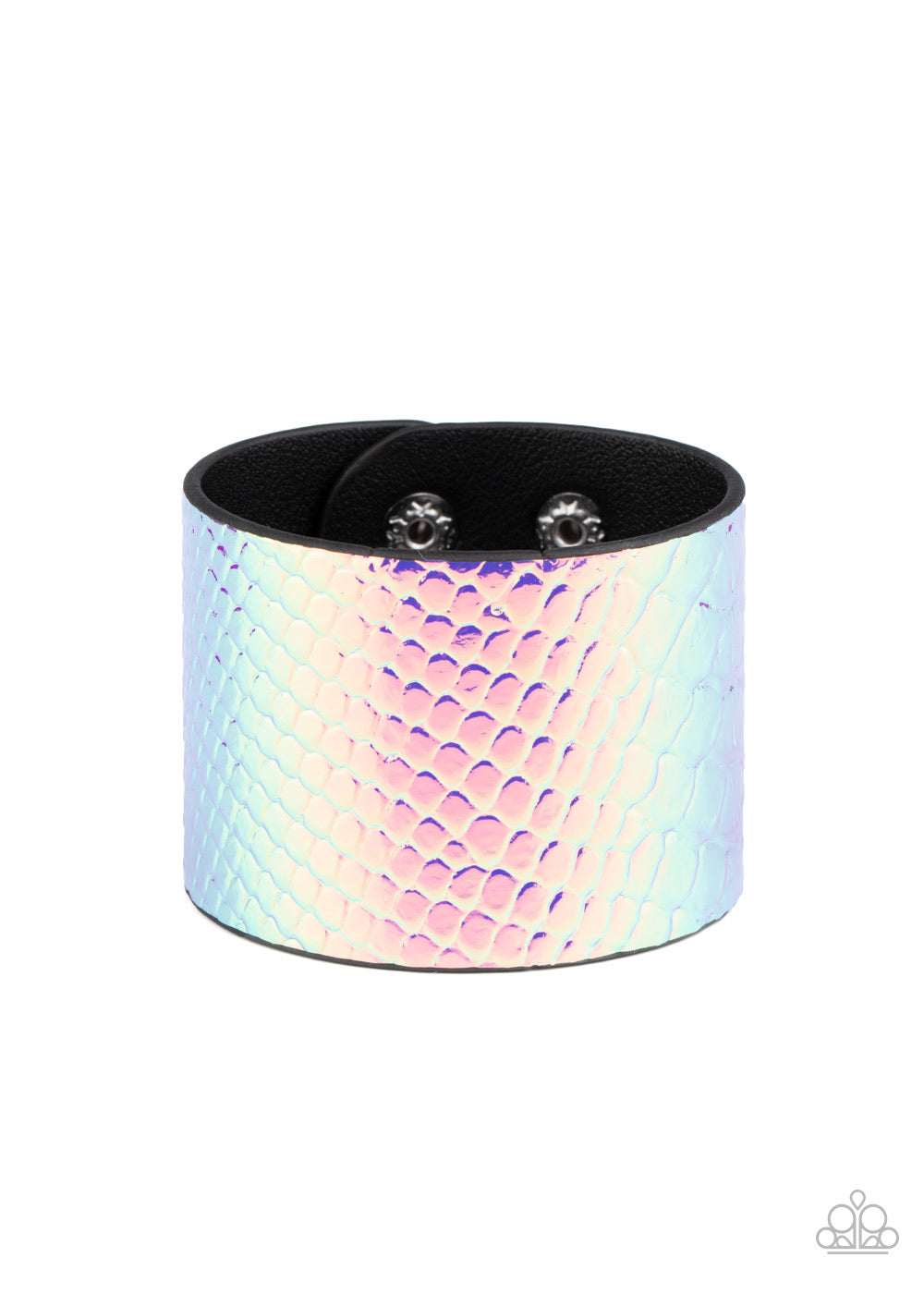 Featuring an iridescent crocodile pattern, a metallic pink leather band wraps around the wrist for a retro look. Features an adjustable snap closure.