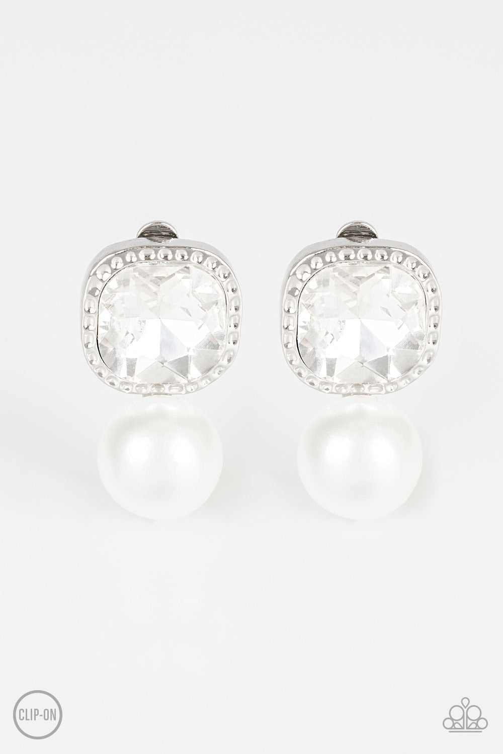 A faceted white gem is pressed into a square silver frame. A classic white pearl is pressed into the bottom of a delicately hammered frame for a glamorous finish. Earring attaches to a standard clip-on fitting.