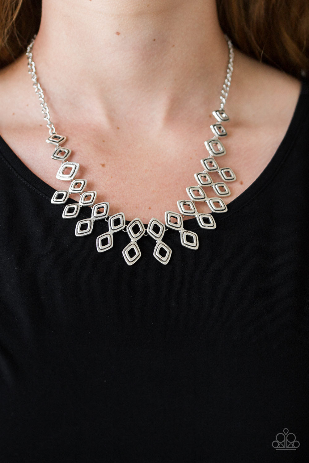 Brushed in an antiqued shimmer, glistening diamond-shaped silver frames link below the collar, coalescing into an edgy geometric fringe. Features an adjustable clasp closure.