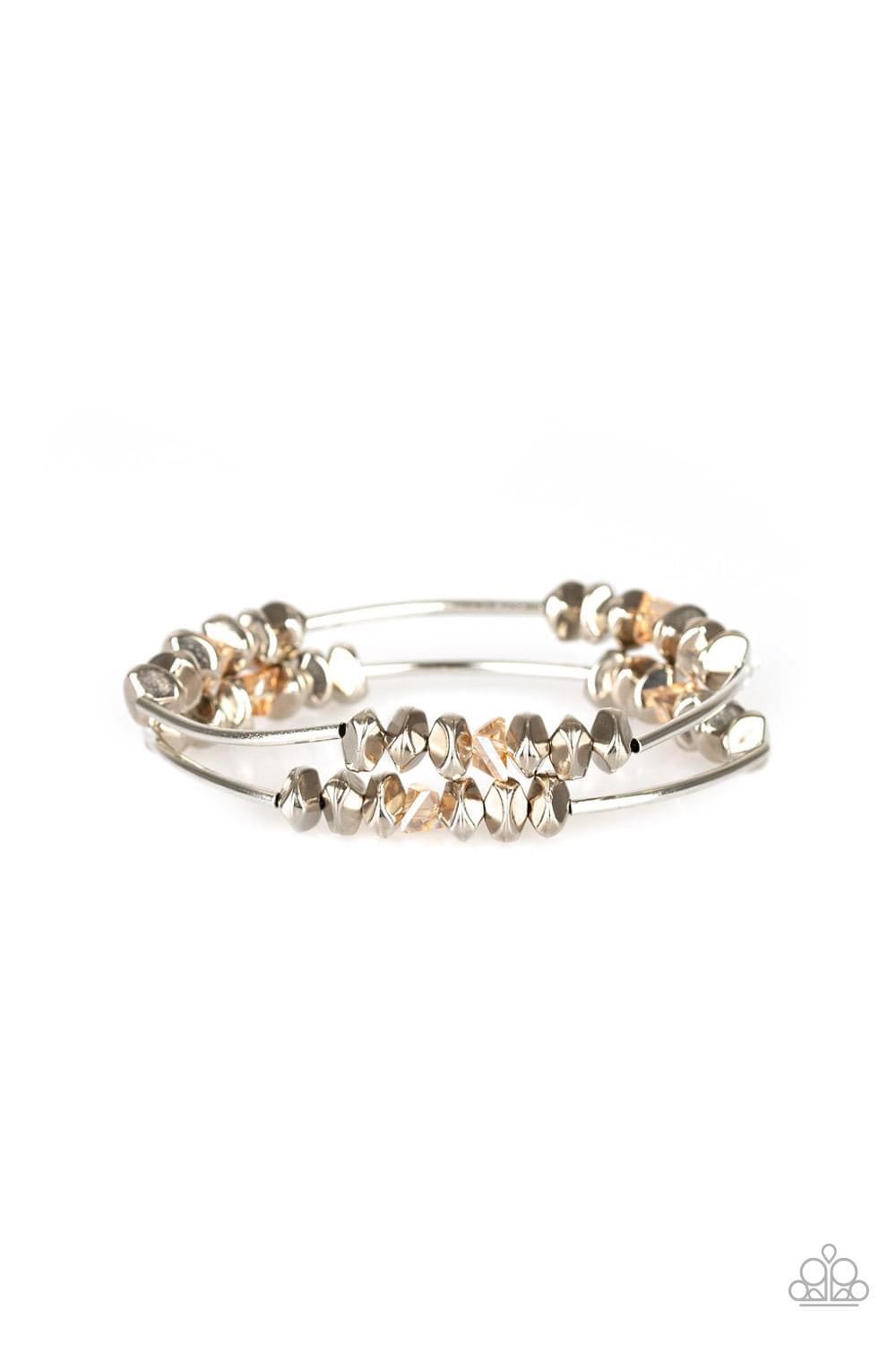 A collection of faceted silver beads, glittery brown crystal-like beads, and silver bar accents are threaded along stretchy bands around the wrist for a refined look.