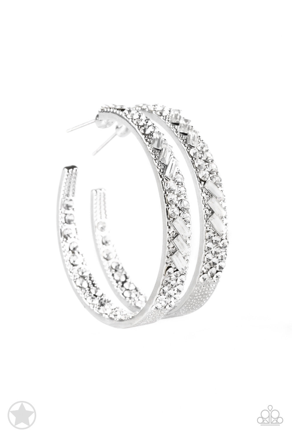 The front facing surface of a chunky silver hoop is dipped in brilliantly sparkling rhinestones while light-catching texture wraps around the back. The interior of the hoop features the opposite pattern, creating the illusion of a full hoop of blinding rhinestones. Earring attaches to a standard post fitting. Hoop measures 1 3/4" in diameter.