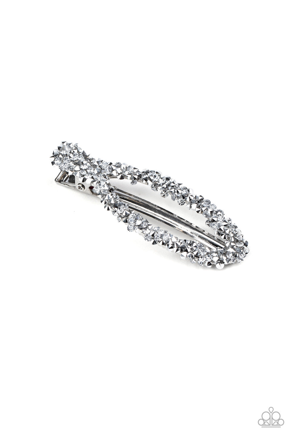 A collision of glittery white and smoky hematite rhinestones sparkle across the front of an oval frame, creating a glittery centerpiece. Features a standard hair clip.