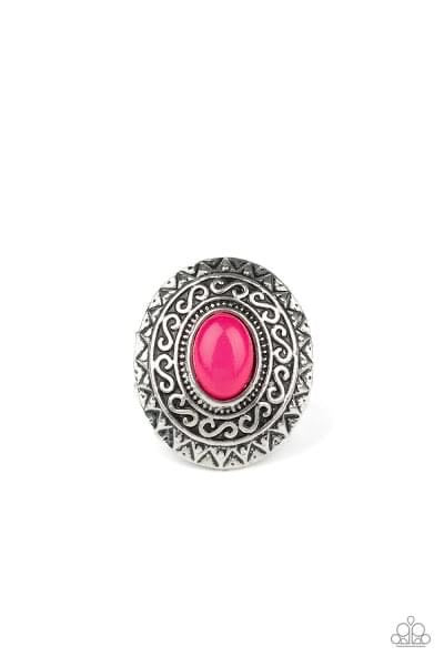 A glowing pink stone is pressed in the center of a dramatic silver frame radiating with shimmery sunburst details for a seasonal look. Features a stretchy band for a flexible fit.