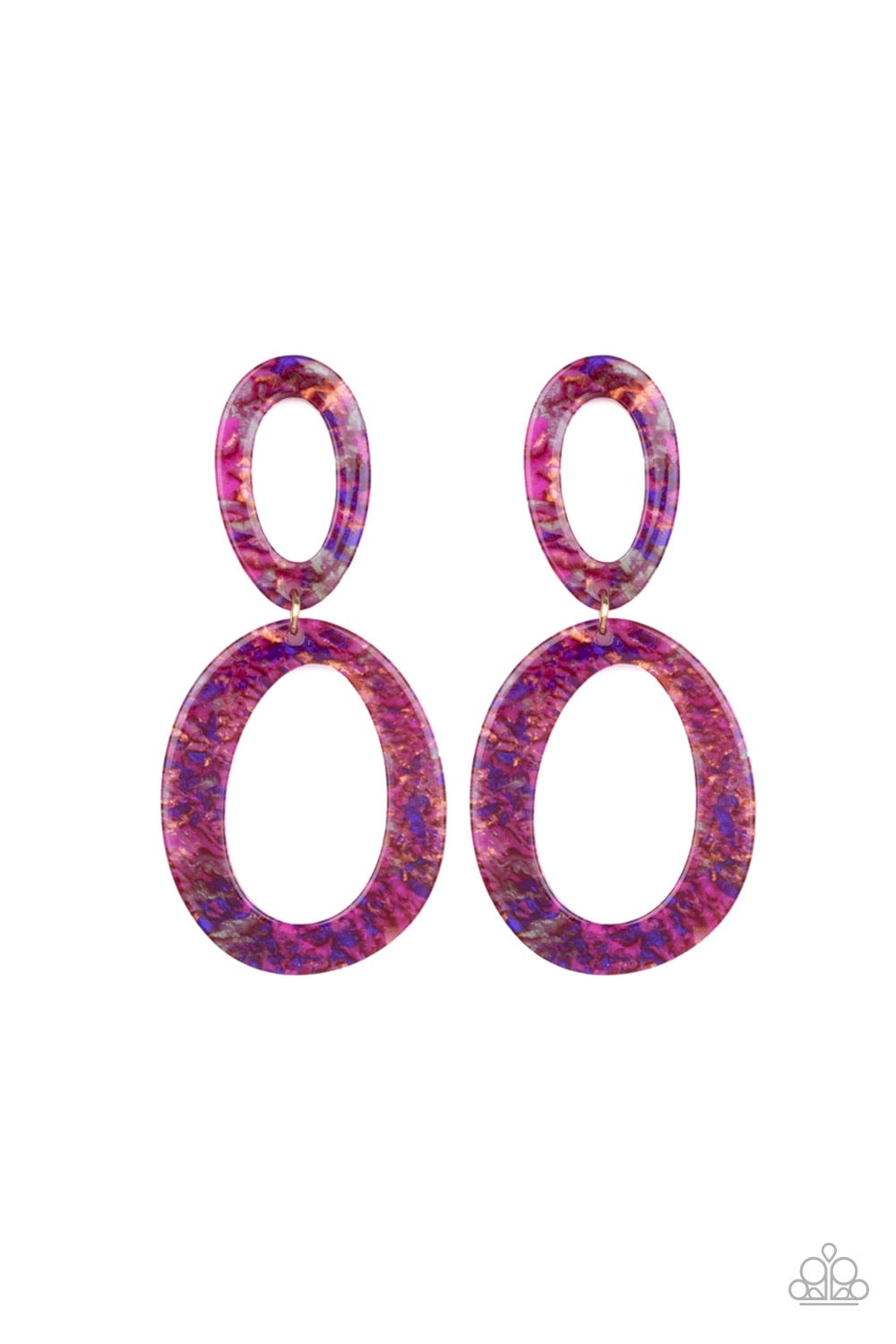 Featuring colorful metallic accents, linked shimmery acrylic frames trickle from the ear for a retro look. Colors may vary. Earring attaches to a standard post fitting.