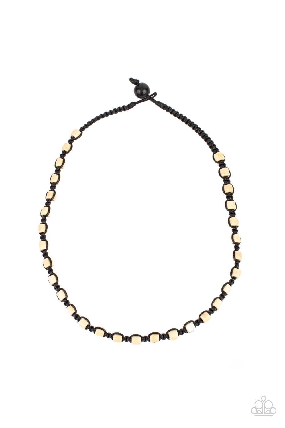 Natural round wooden beads are knotted into a rustic black cord creating an earthy homespun necklace below the collar. Features a button loop closure.