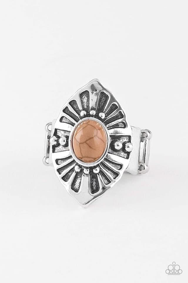 An earthy brown stone bead is pressed into the center of an angular silver frame radiating with studded and antiqued textures. Features a stretchy band for a flexible fit.