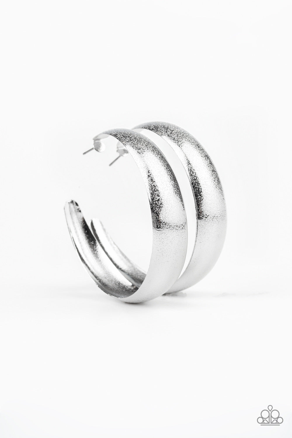 Hammered in blinding shimmer, a thick silver hoop curls around the ear for a grunge-glamorous look. Earring attaches to a standard post fitting. Hoop measures approximately 2 1/4" in diameter.