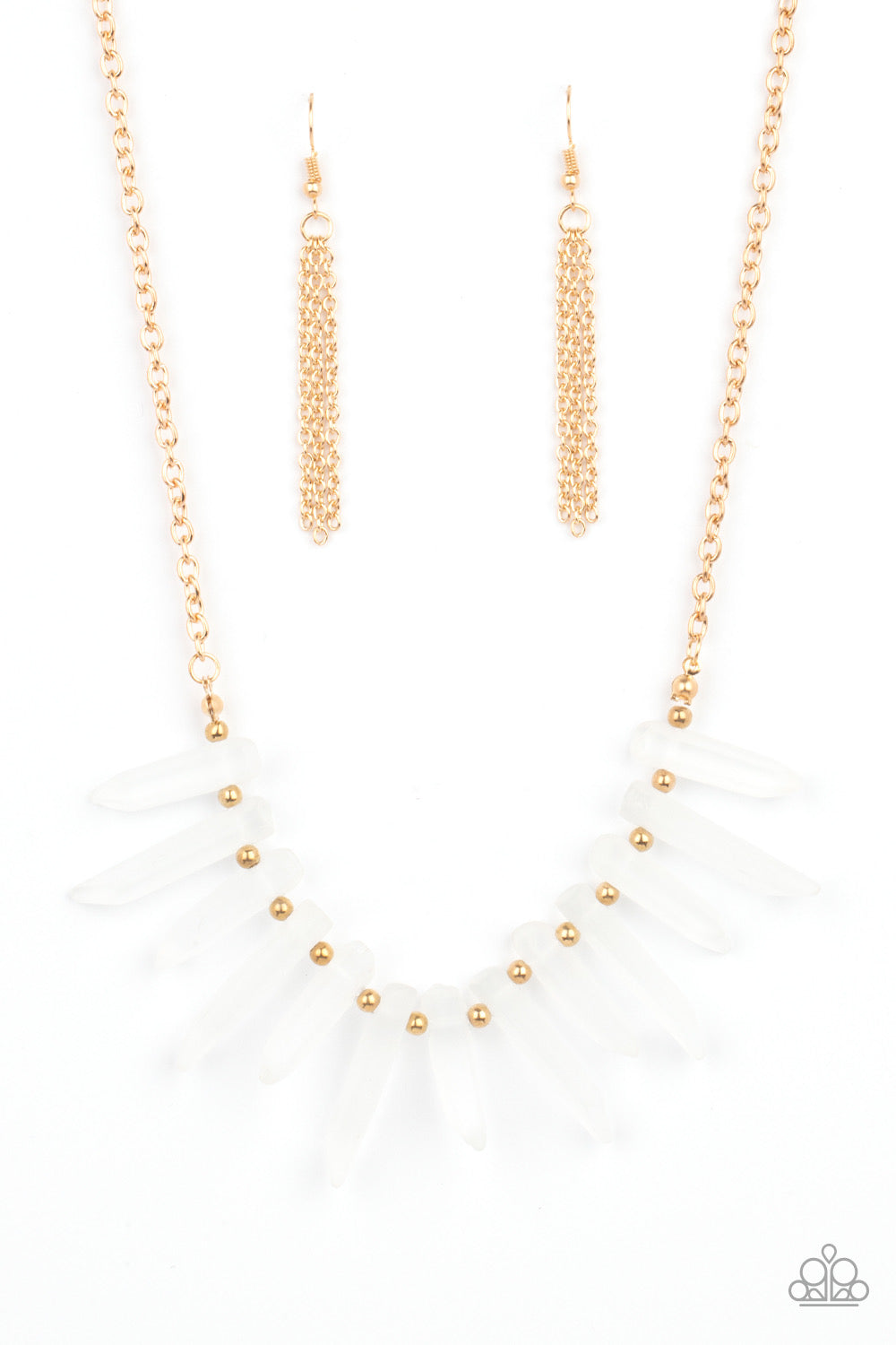 Separated by dainty gold beads, an opaque collection of glassy-like icicle beads fans out below the collar, creating an icy fringe. Features an adjustable clasp closure.