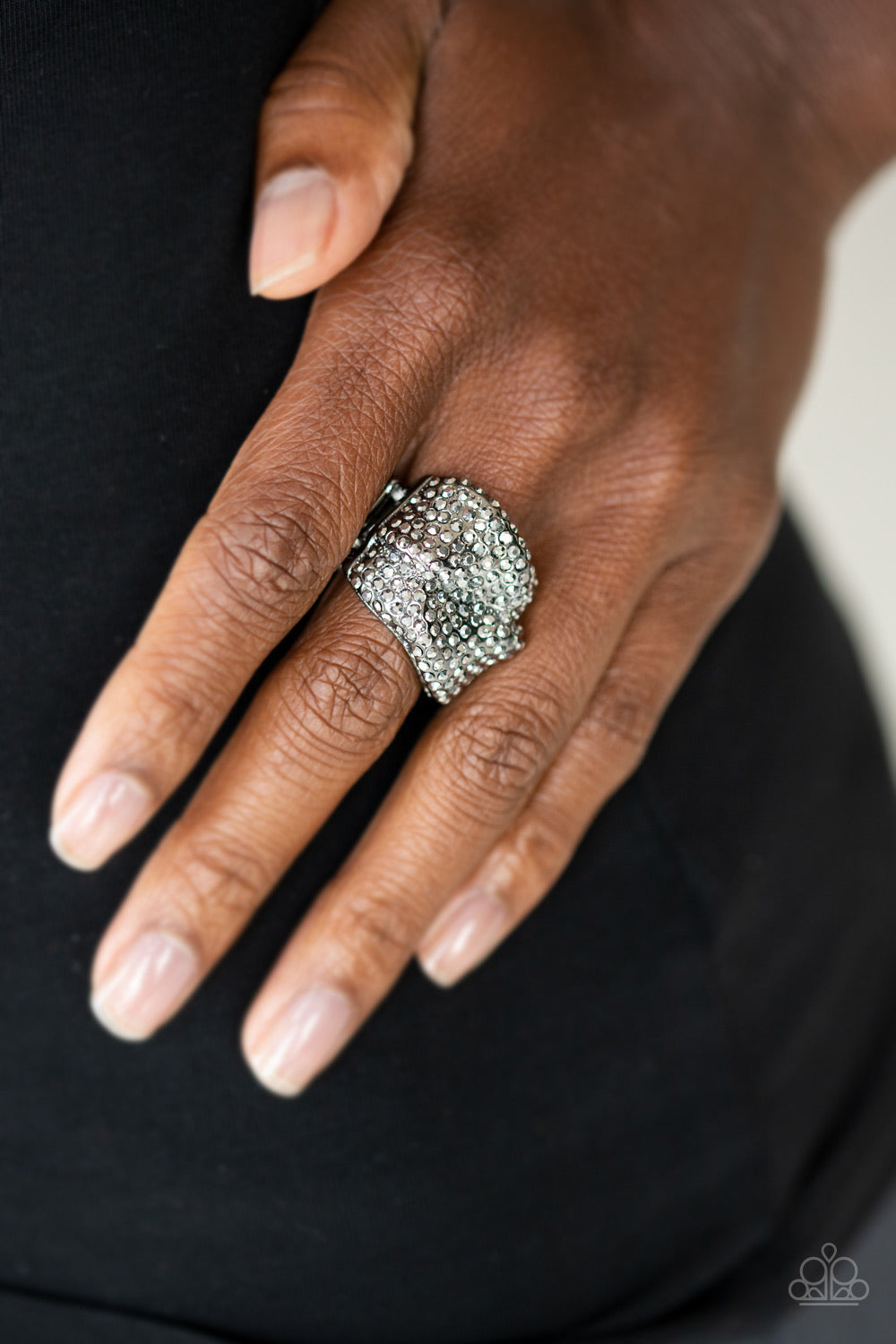 Encrusted in row after row of smoky hematite rhinestones, warped gunmetal bands coalesce into a single sparkling frame across the finger for an edgy look. Features a stretchy band for a flexible fit.