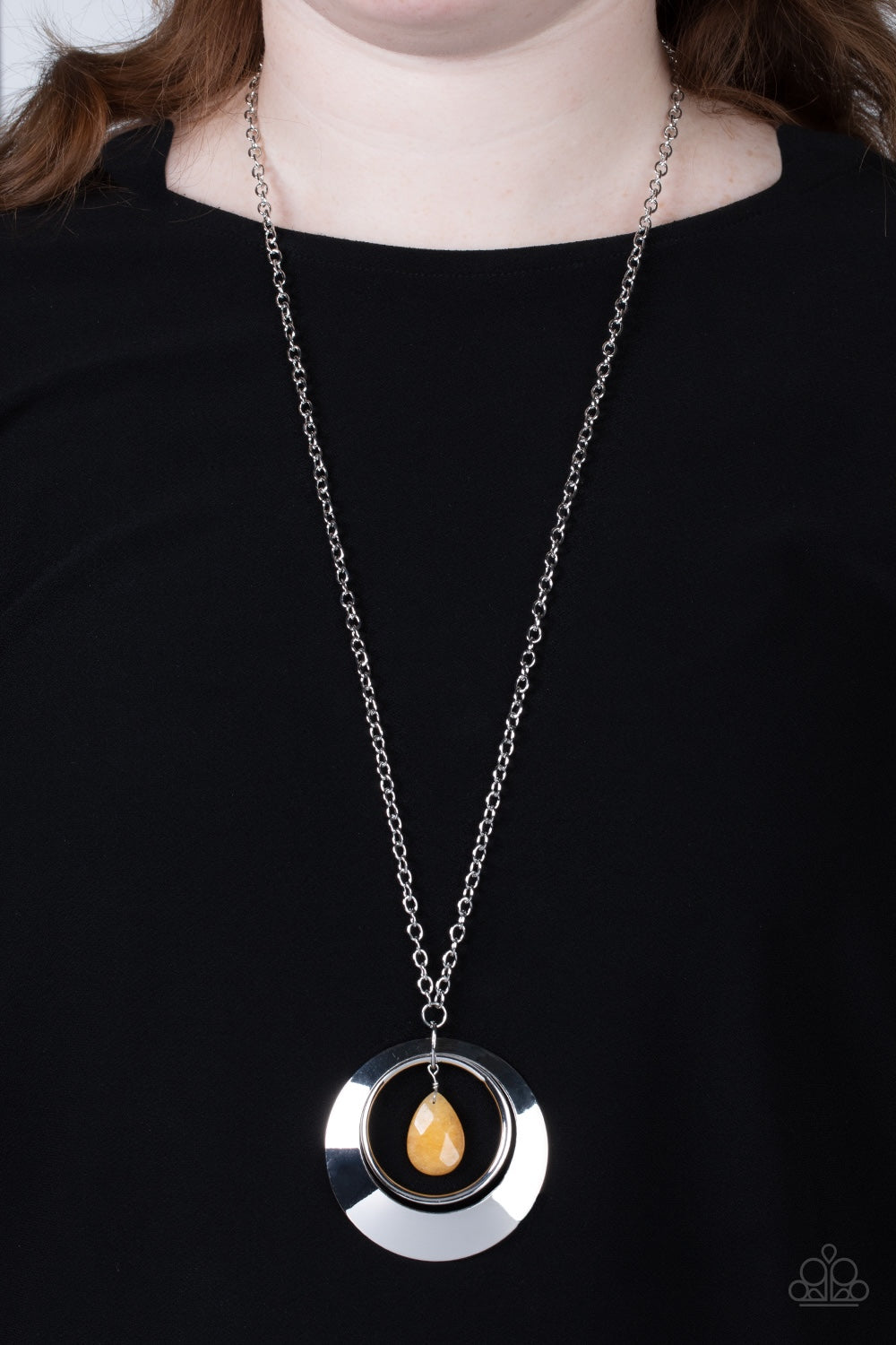 A faceted yellow stone teardrop swings from the top of a bold silver ring and flared silver hoop, creating an enchanting pendant at the bottom of a lengthened silver chain. Features an adjustable clasp closure.