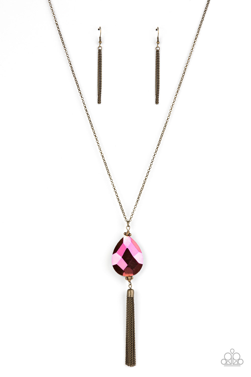 Infused with a glistening brass chain tassel, an oversized oil spill teardrop gem swings from the bottom of a lengthened brass chain for a glamorously glitzy finish. Features an adjustable clasp closure.