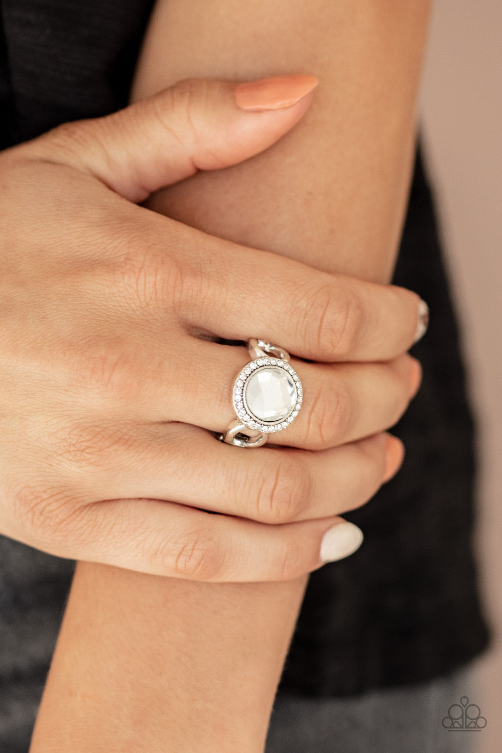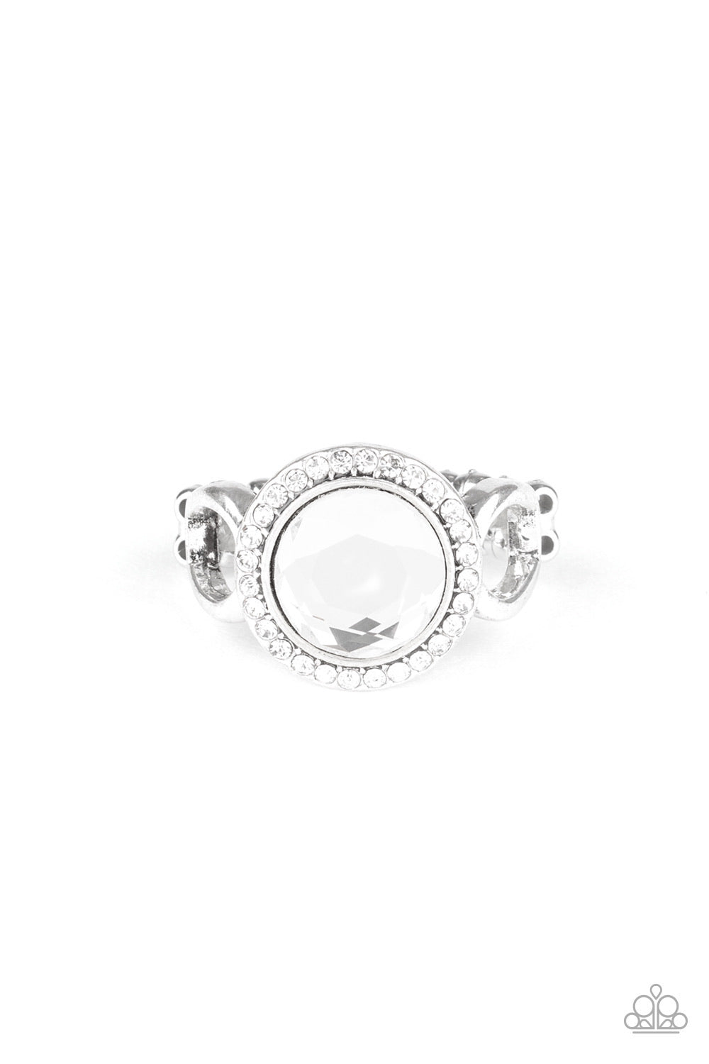 An oversized white gem is pressed into the center of a round silver frame encrusted in a ring of radiant white rhinestones for a regal flair. Features a dainty stretchy band for a flexible fit.