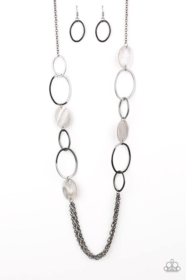 Brushed in a shell-like iridescence, a collection of flat oval beads and mismatched gunmetal hoops give way to layers of gunmetal chains down the chest for a whimsical look. Features an adjustable clasp closure.