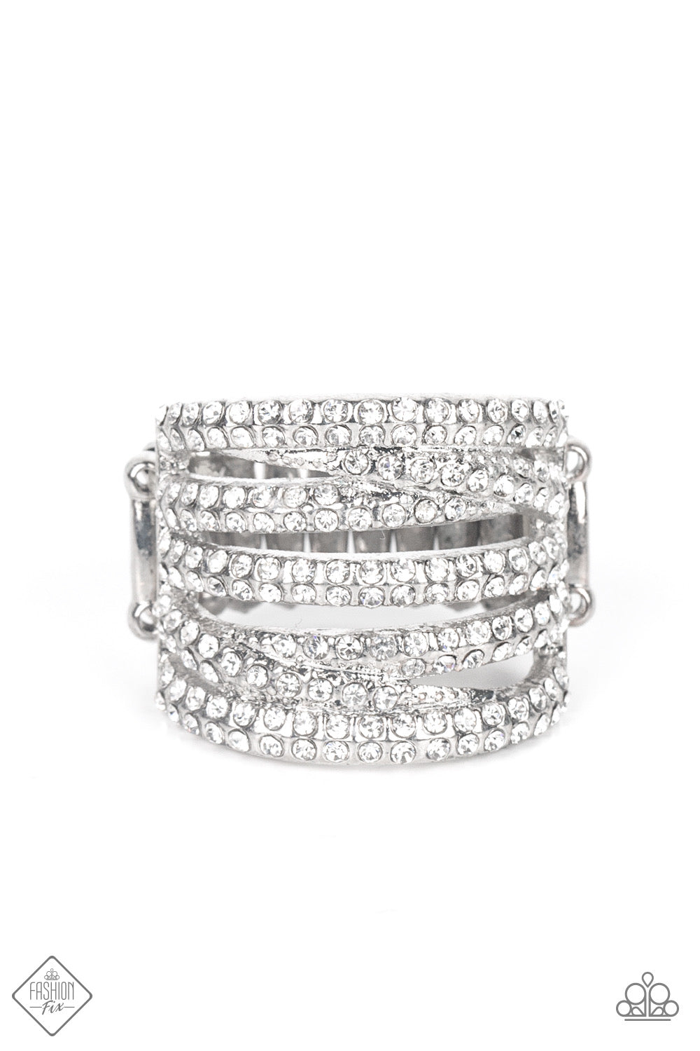 Encrusted in dainty pairs of blinding white rhinestones, row after row of glitzy silver bands stack and crisscross across the finger for a knockout look. Features a stretchy band for a flexible fit.