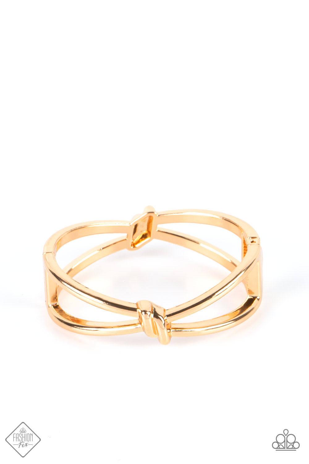Striking gold bars delicately knot at the top and bottom of the wrist, resulting in a sultry bangle-like bracelet that's brushed in high-sheen shimmer. Features a hinged closure.
