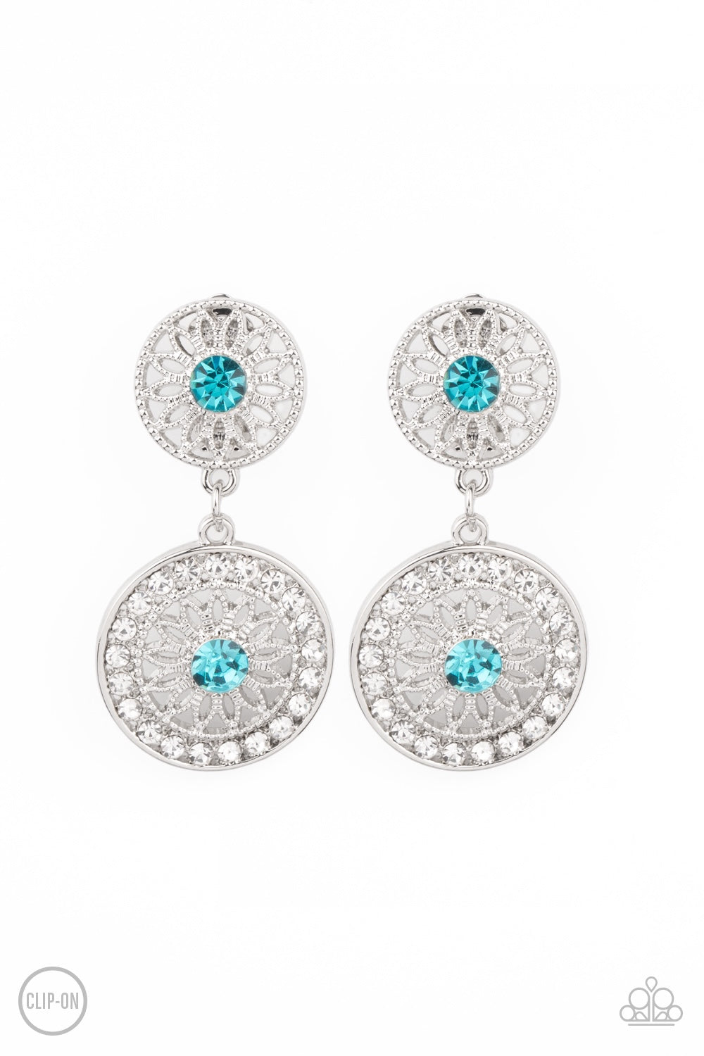 Dotted with glittery blue rhinestone centers, shimmery silver floral frames link into a whimsical lure. The lower frame is bordered in glassy white rhinestones for a timeless finish. Earring attaches to a standard clip-on fitting.
