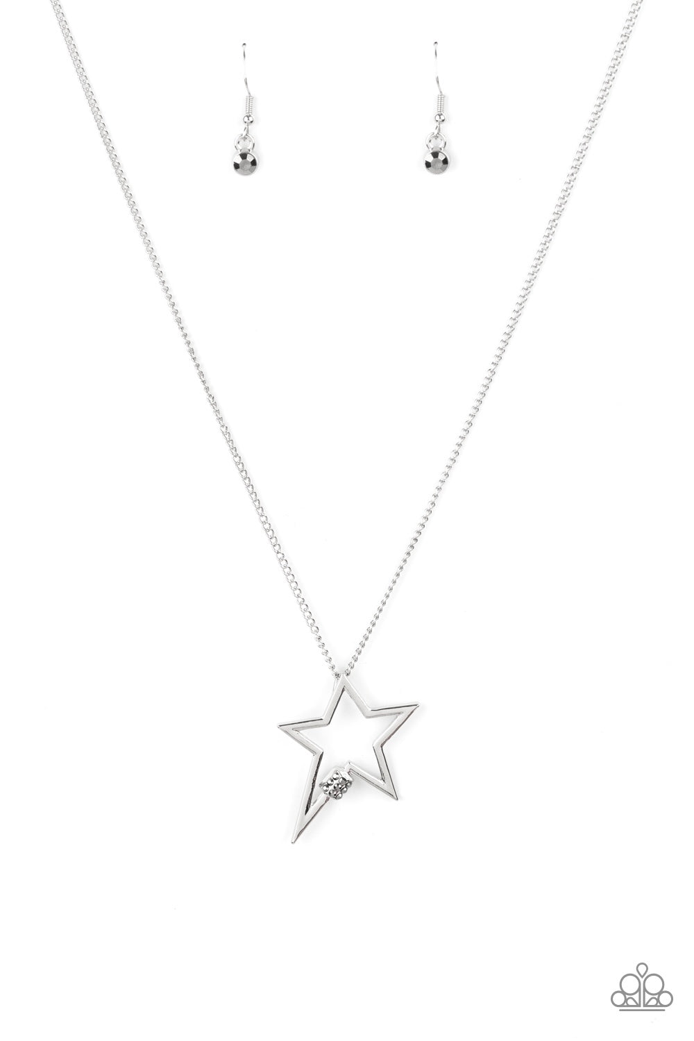 Infused with a dainty hematite rhinestone beaded accent, a striking silver star glides along a shiny silver chain below the collar, creating a stellar pendant. Features an adjustable clasp closure.