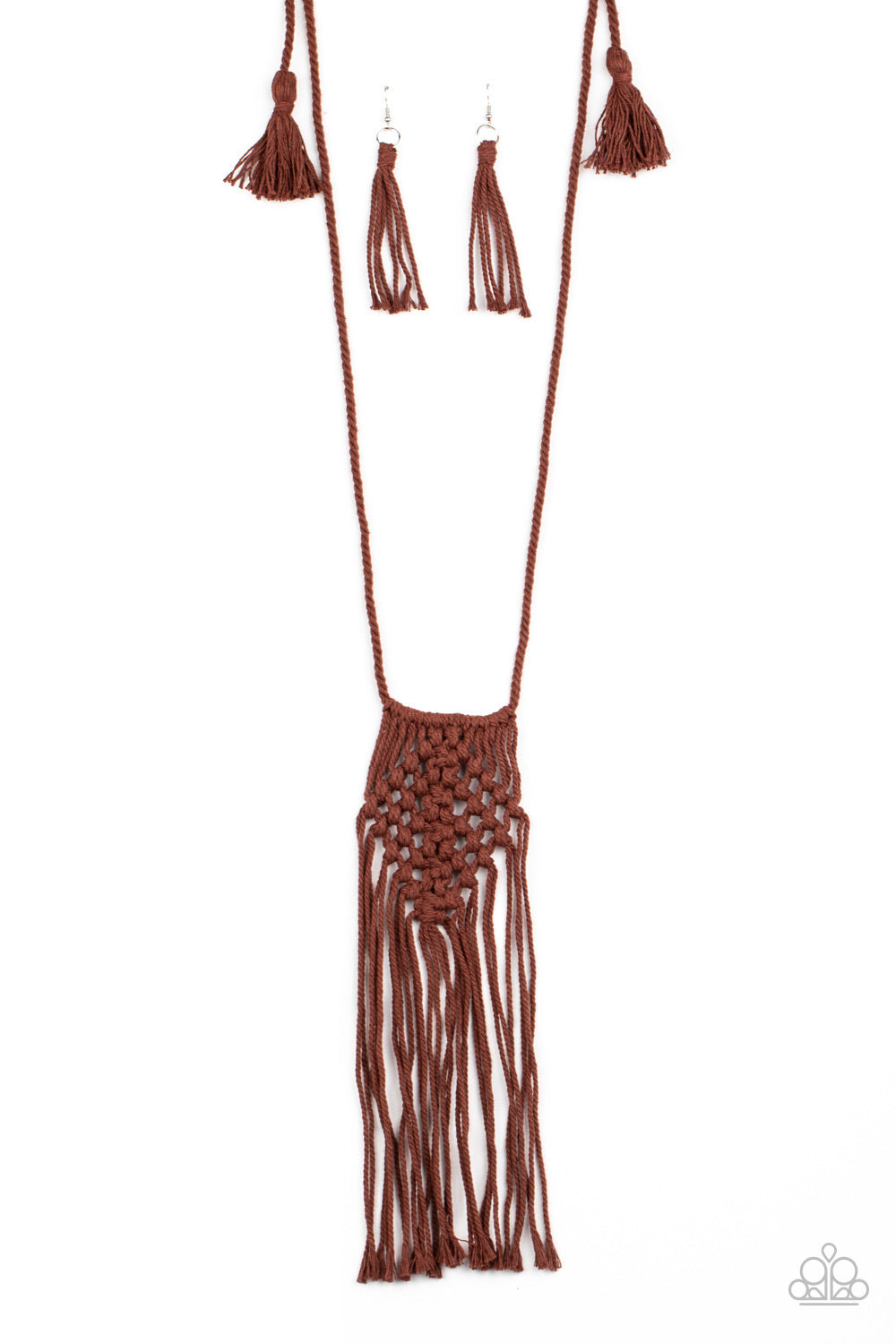 Brown twine-like cording decoratively knots into a macramé inspired pendant at the bottom of lengthened strands of twisted cording. Featuring frayed ends, excess cording streams from the bottom of the knotted centerpiece, creating an earthy fringe. Features an adjustable sliding knot closure.