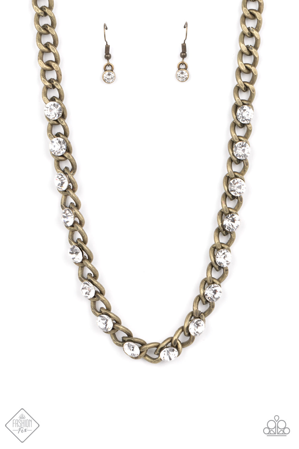 Sparkling white rhinestones are nestled inside the gritty links of an oversized antiqued brass chain resulting in a dauntless display below the collar. Features an adjustable clasp closure.