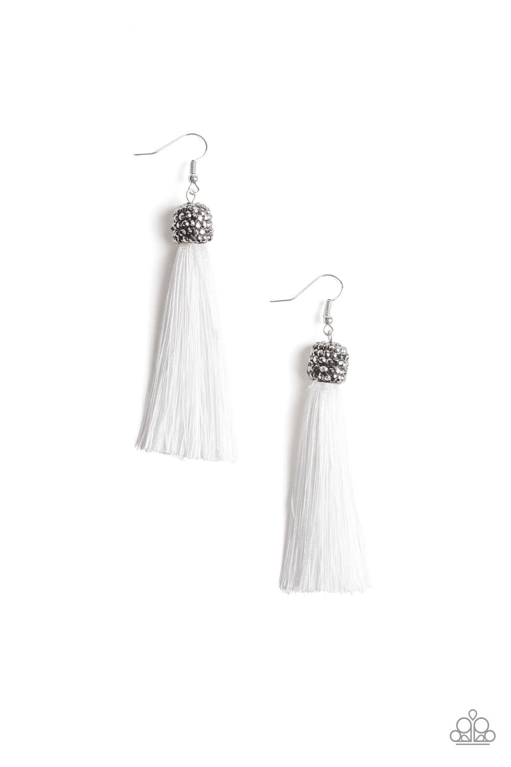 Encrusted in row after row of hematite rhinestones, a glittery gunmetal bead gives way to a plume of shiny white thread for an elegantly tasseled look. Earring attaches to a standard fishhook fitting.