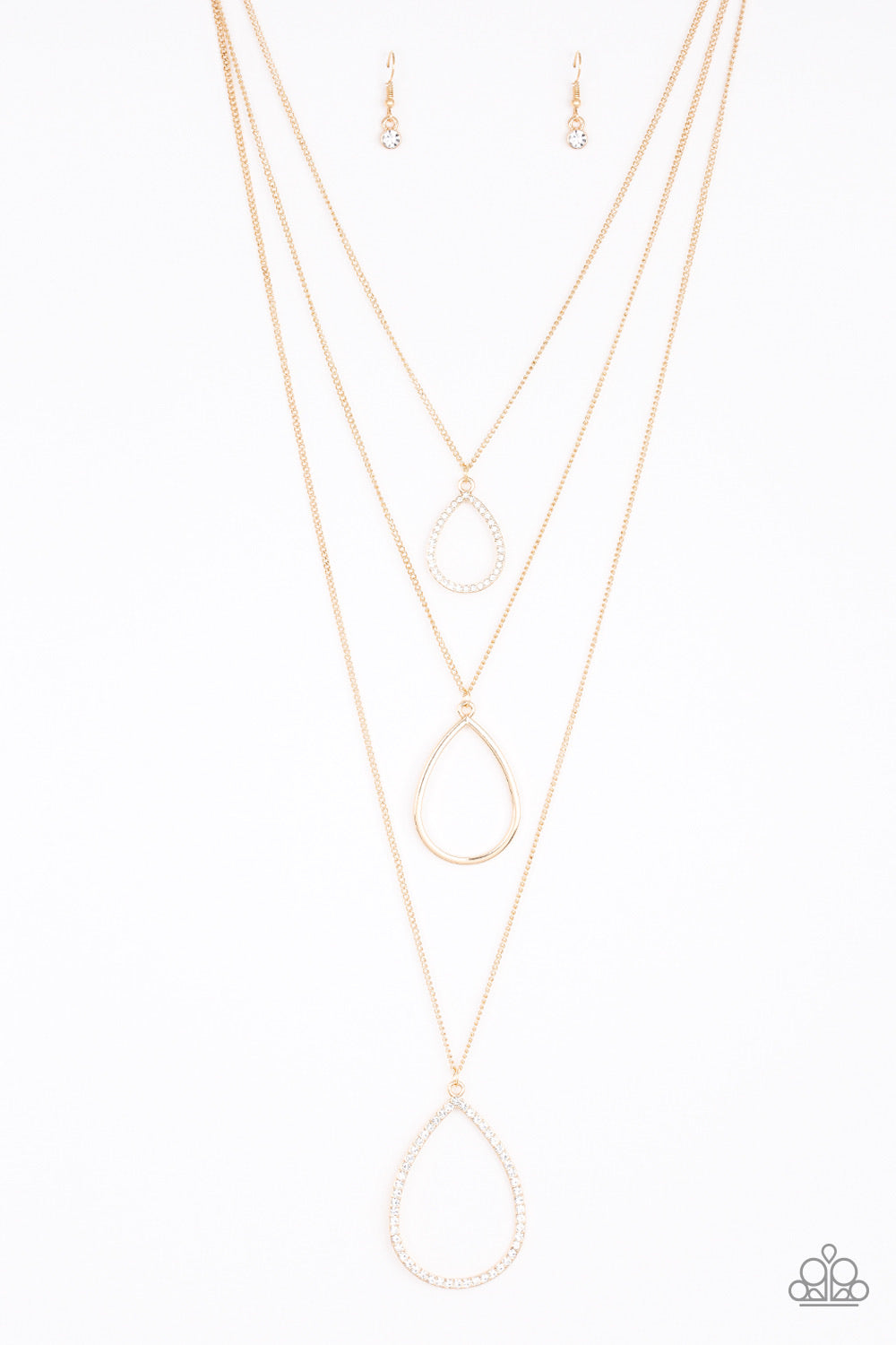 A smooth gold teardrop swings between two white rhinestone encrusted teardrop frames, creating refined layers down the chest. Features an adjustable clasp closure.