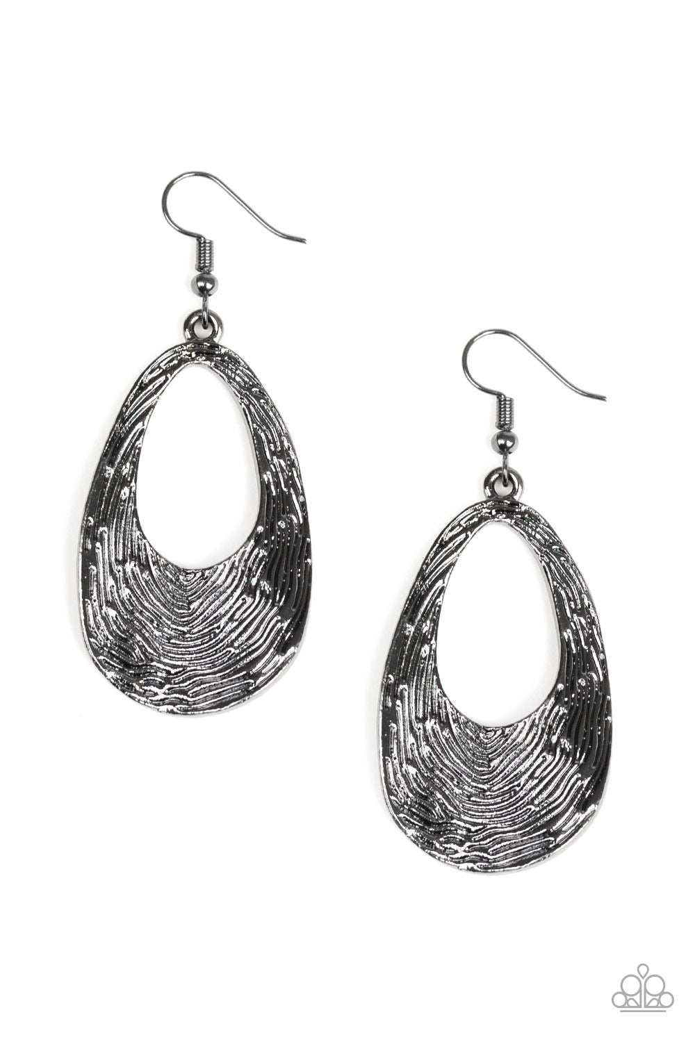 Rippling with tactile texture, an abstract gunmetal teardrop swings from the ear for a casual look. Earring attaches to a standard fishhook fitting.