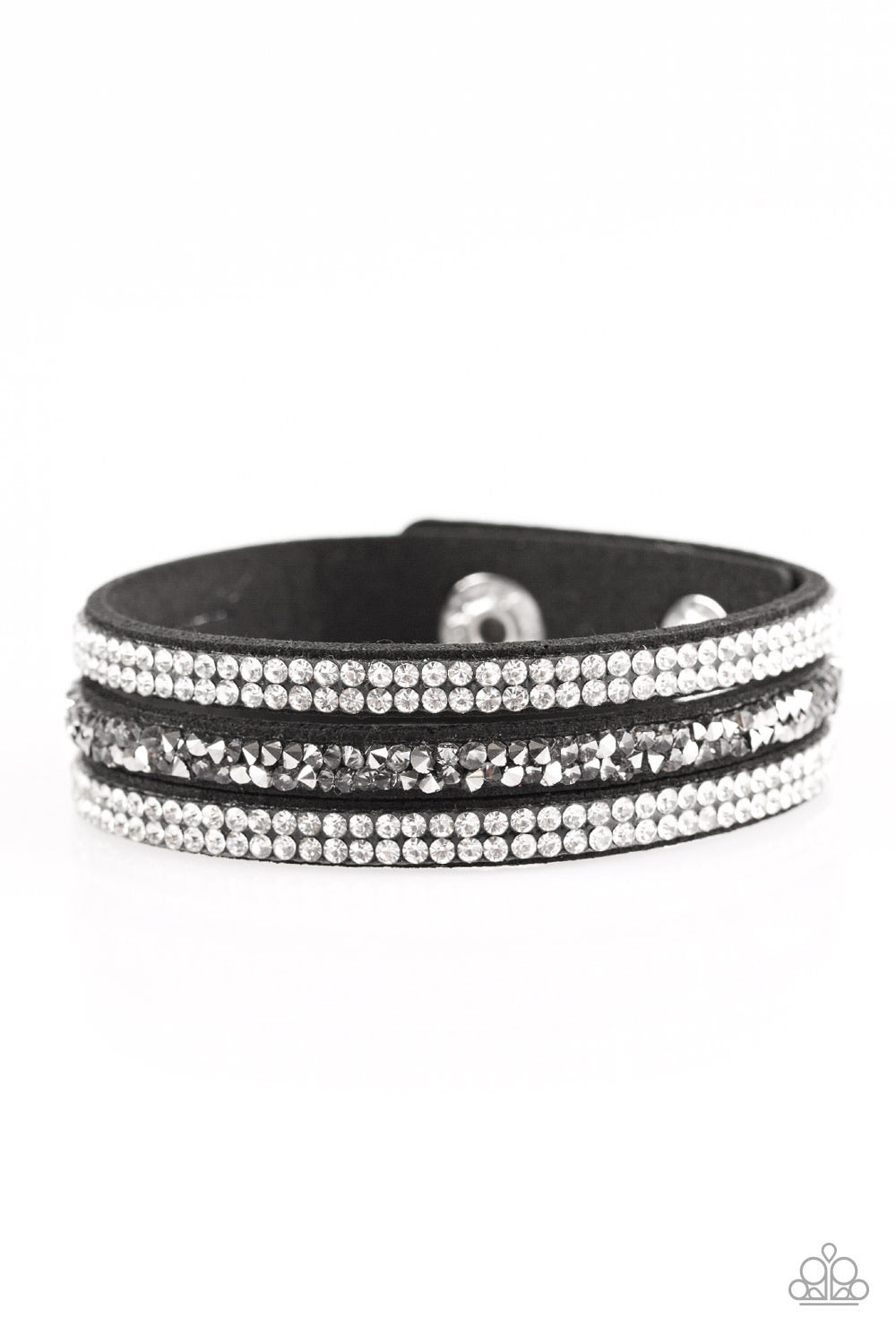 Glittery white and glassy hematite rhinestones are sprinkled along three strands of black suede for a glamorous look. Features an adjustable snap closure.