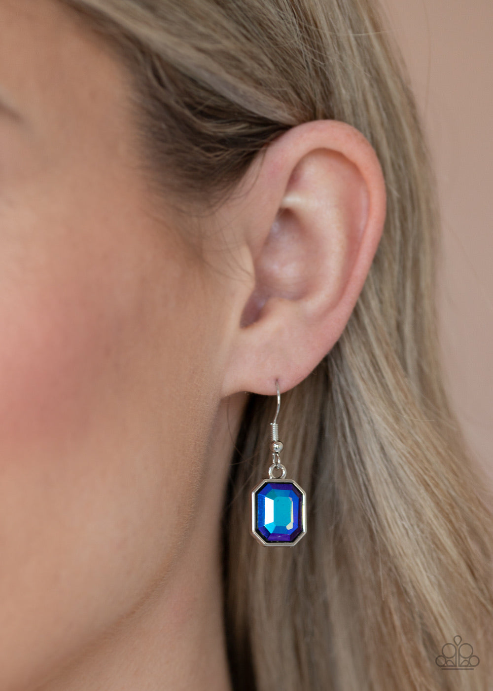 Featuring an out-of-this-world iridescence, emerald-cut blue gems delicately link below the collar. Attached to a dainty silver chain, the glittering row of rhinestones gives way to a dramatically oversized matching blue gem pendant for a statement-making finish. Features an adjustable clasp closure.
