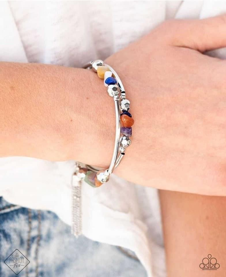 An earthy collection of faceted silver beads, raw cut multicolored rock beads, and cylindrical silver accents are threaded along a coiled wire around the wrist for a grounding pop of color. A shimmery silver chain tassel swings from one end of the spiral, adding a hint of flirtatious movement to the piece.