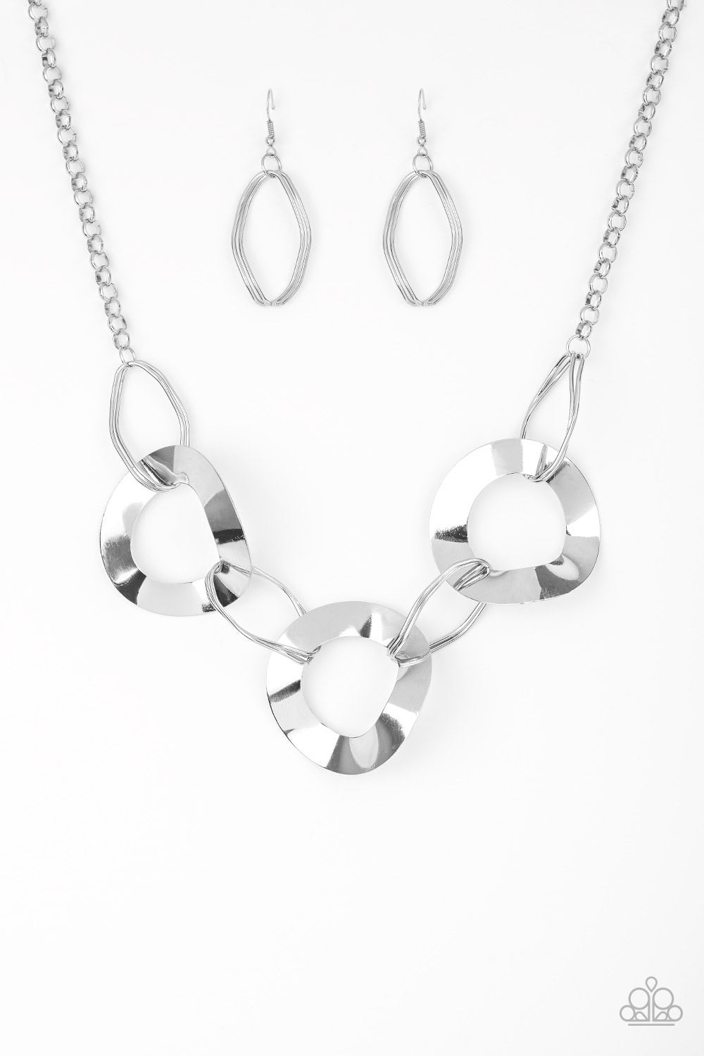 Featuring slightly warped surfaces, asymmetrical silver hoops link with reflective silver rings below the collar for a modern look. Features an adjustable clasp closure.