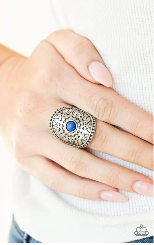 An antiqued silver sunburst pattern blooms from a refreshing French Blue beaded center, creating a radiant frame atop the finger. Features a stretchy band for a flexible fit.