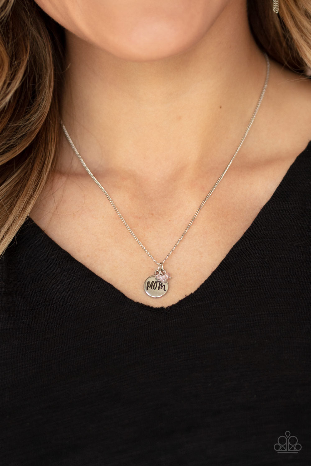 A dainty cluster of pink crystal-like beads and a dainty silver disc stamped in the word, "Mom", slides along a dainty silver chain, creating a sparkling pendant below the collar. Features an adjustable clasp closure.