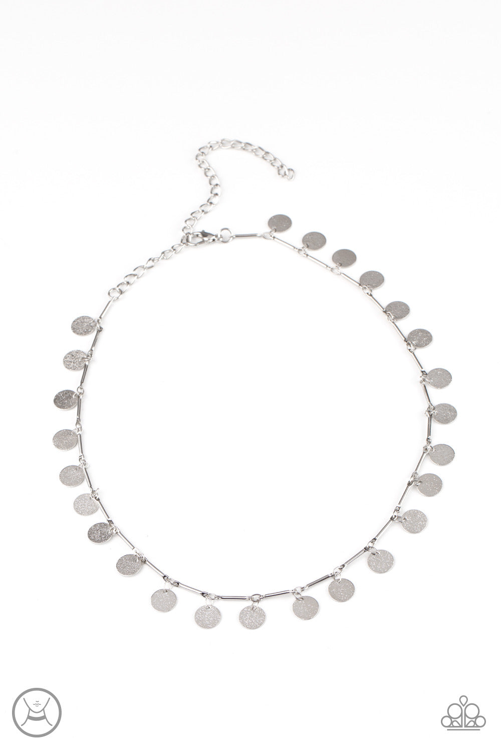 Hammered shiny silver discs swing from interconnected shimmery silver bars around the neck, creating a shimmery fringe. Features an adjustable clasp closure.