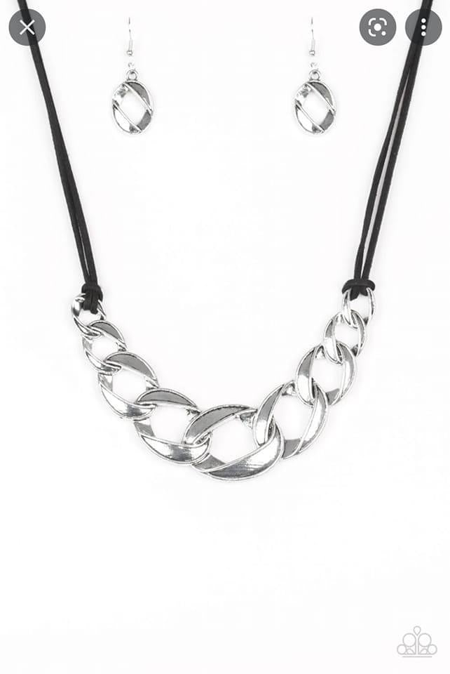 Strands of black suede knot around interconnecting silver links, creating a bold pendant below the collar. Features an adjustable clasp closure.