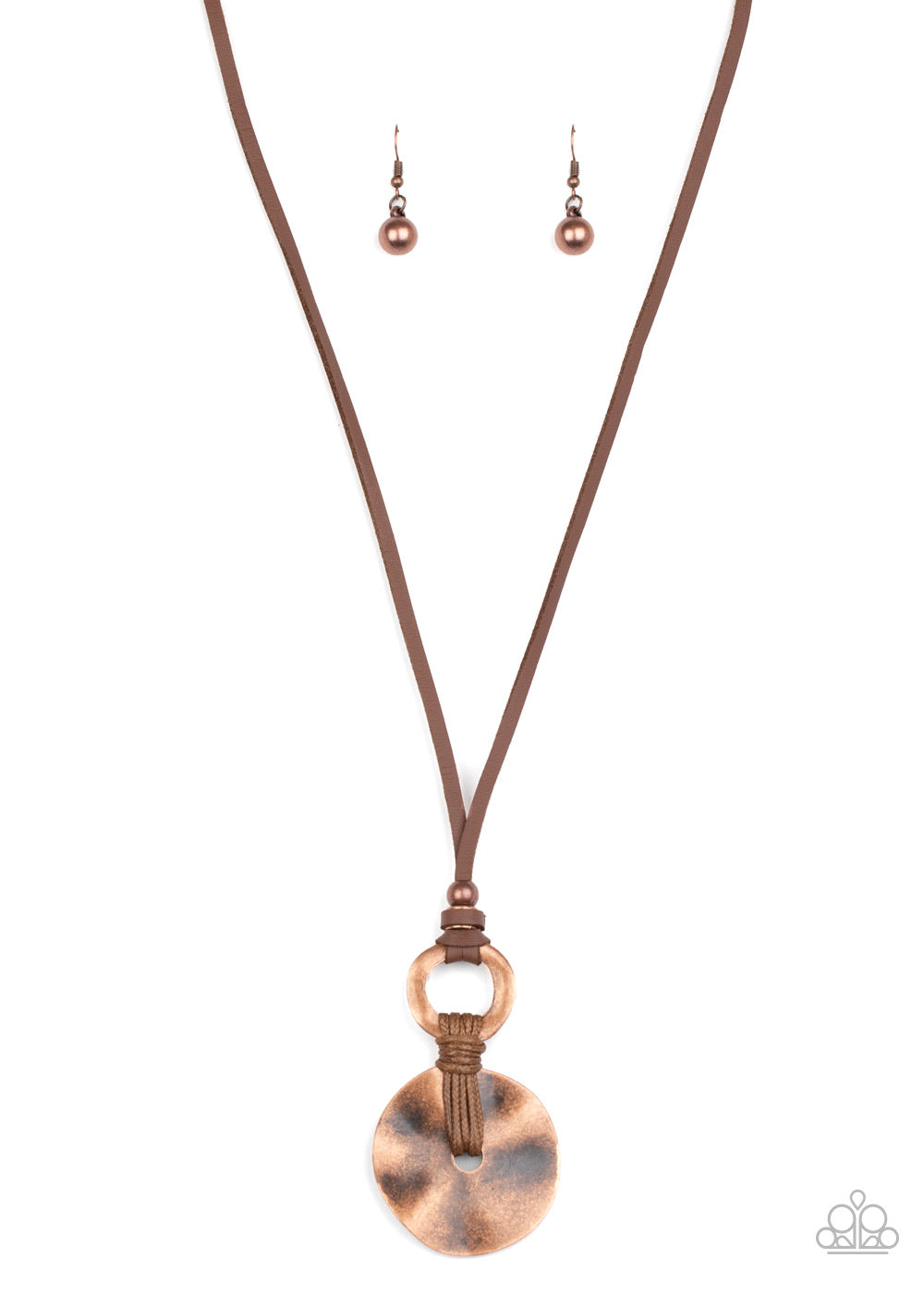 Brushed in an antiqued finish, a hammered copper disc is knotted in place at the bottom of a hammered copper ring, creating a rustic pendant at the bottom of a skinny piece of brown leather. Features an adjustable sliding knot closure.