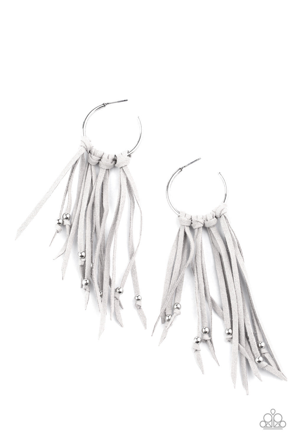 Embellished with dainty silver beads, strands of gray suede knot along the bottom of a dainty silver hoop, creating an earthy fringe. Earring attaches to a standard post fitting. Hoop measures approximately 1" in diameter.