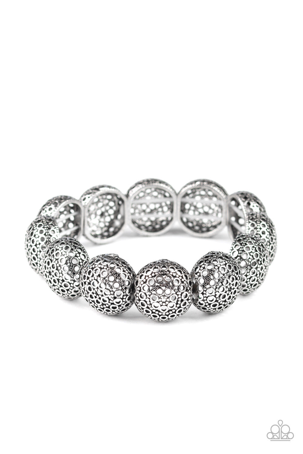 Swirling with ornate details, flowery silver frames are threaded along stretchy bands around the wrist for a whimsical fashion.
