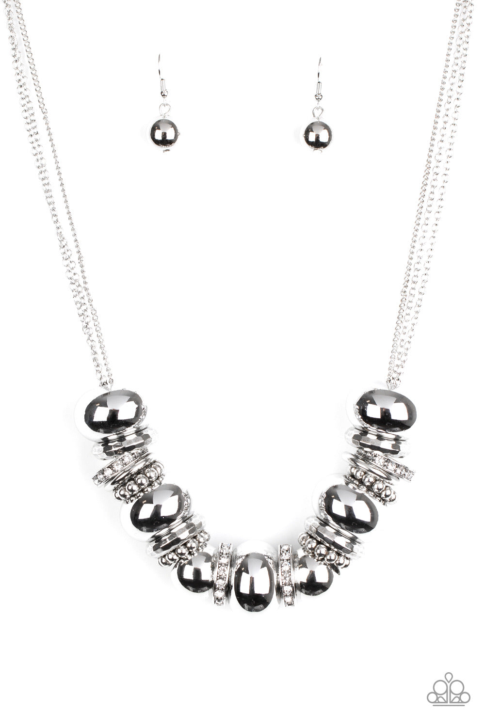 An edgy collision of oversized silver beads, white rhinestone encrusted rings, and studded and hammered hoops slides along dainty silver chains, creating metallic mayhem below the collar. Features an adjustable clasp closure.