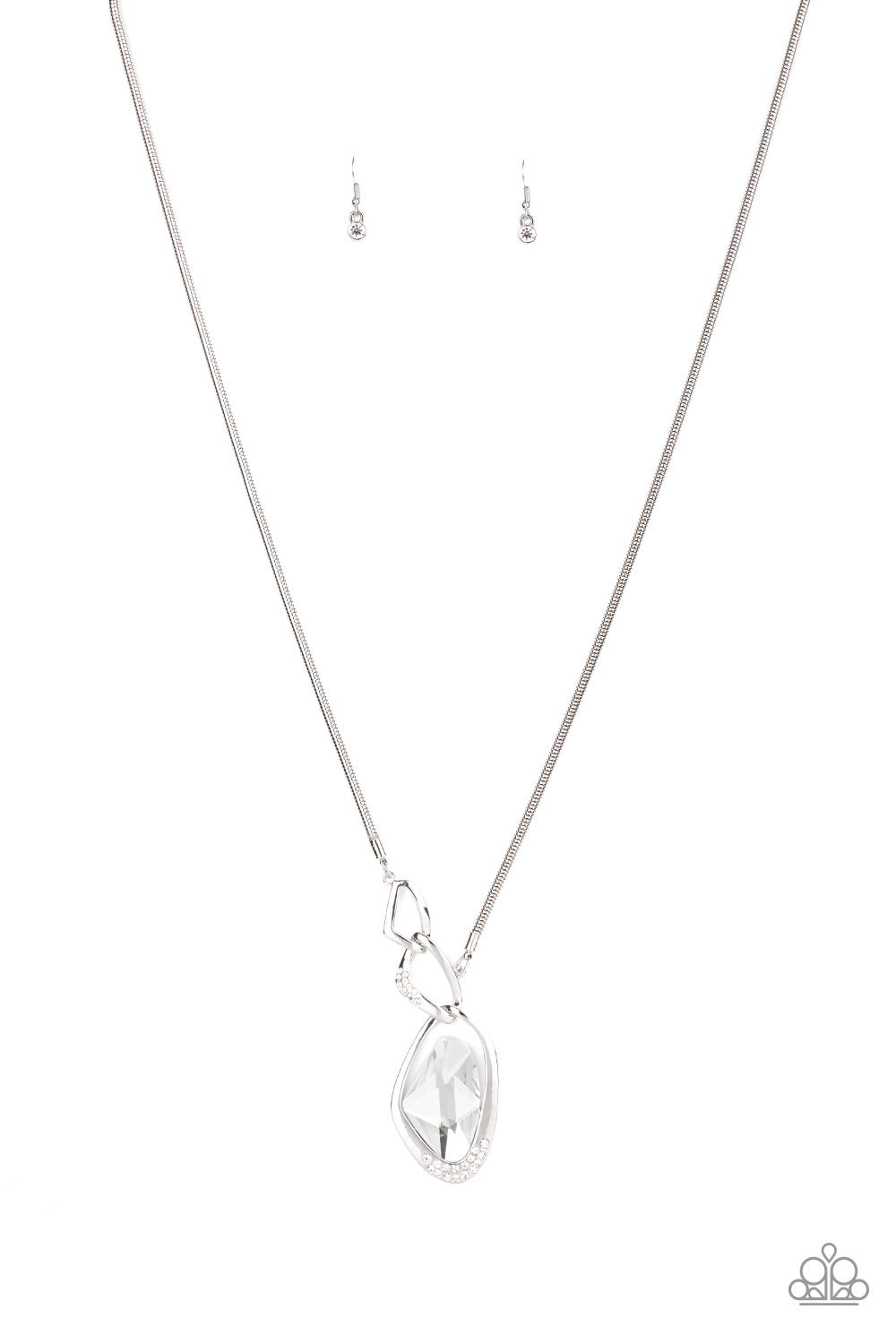 A faceted white gem is nestled inside of a shimmery silver frame encrusted in dainty white rhinestones. The glittery pendant asymmetrically links with abstract silver frames at the bottom of a lengthened silver rounded snake chain for a modern look. Features an adjustable clasp closure.