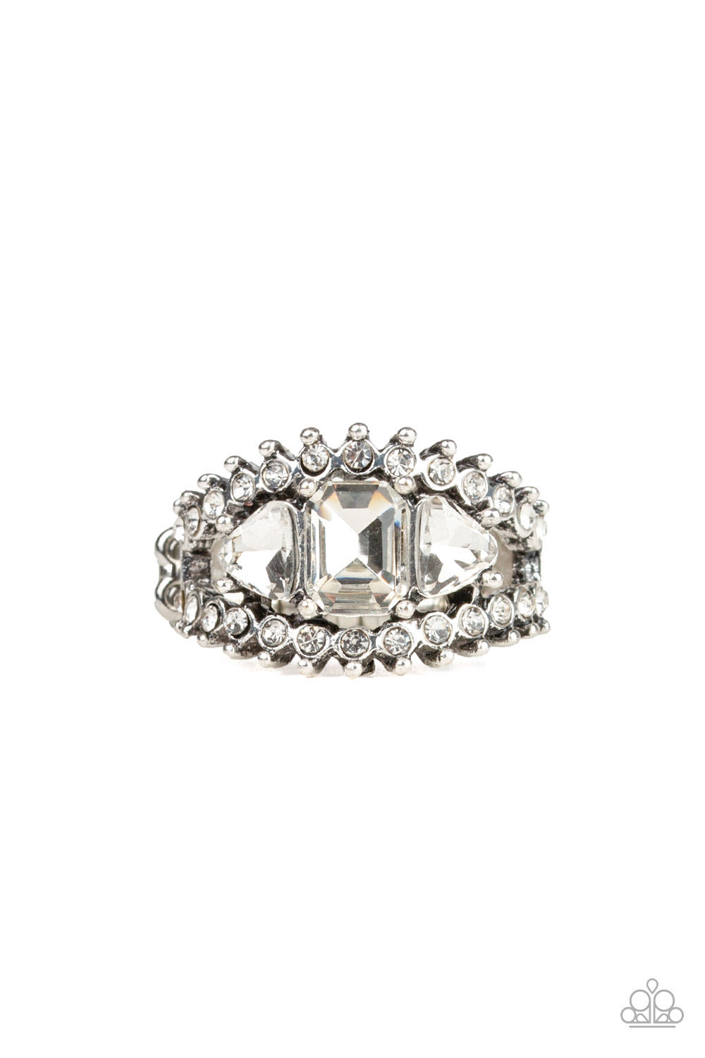 Featuring triangular and emerald style cuts, three white gems are encrusted along the center of a studded silver band stacked with dainty white rhinestones for a glamorous edge. Features a dainty stretchy band for a flexible fit.